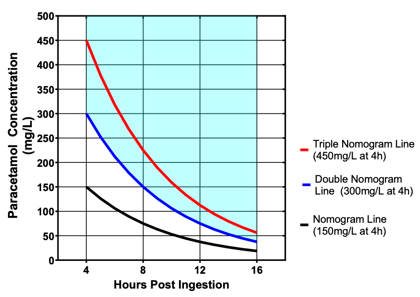 - Serum paracetamol level at 6 hours post-ingestion: 140 mg/L